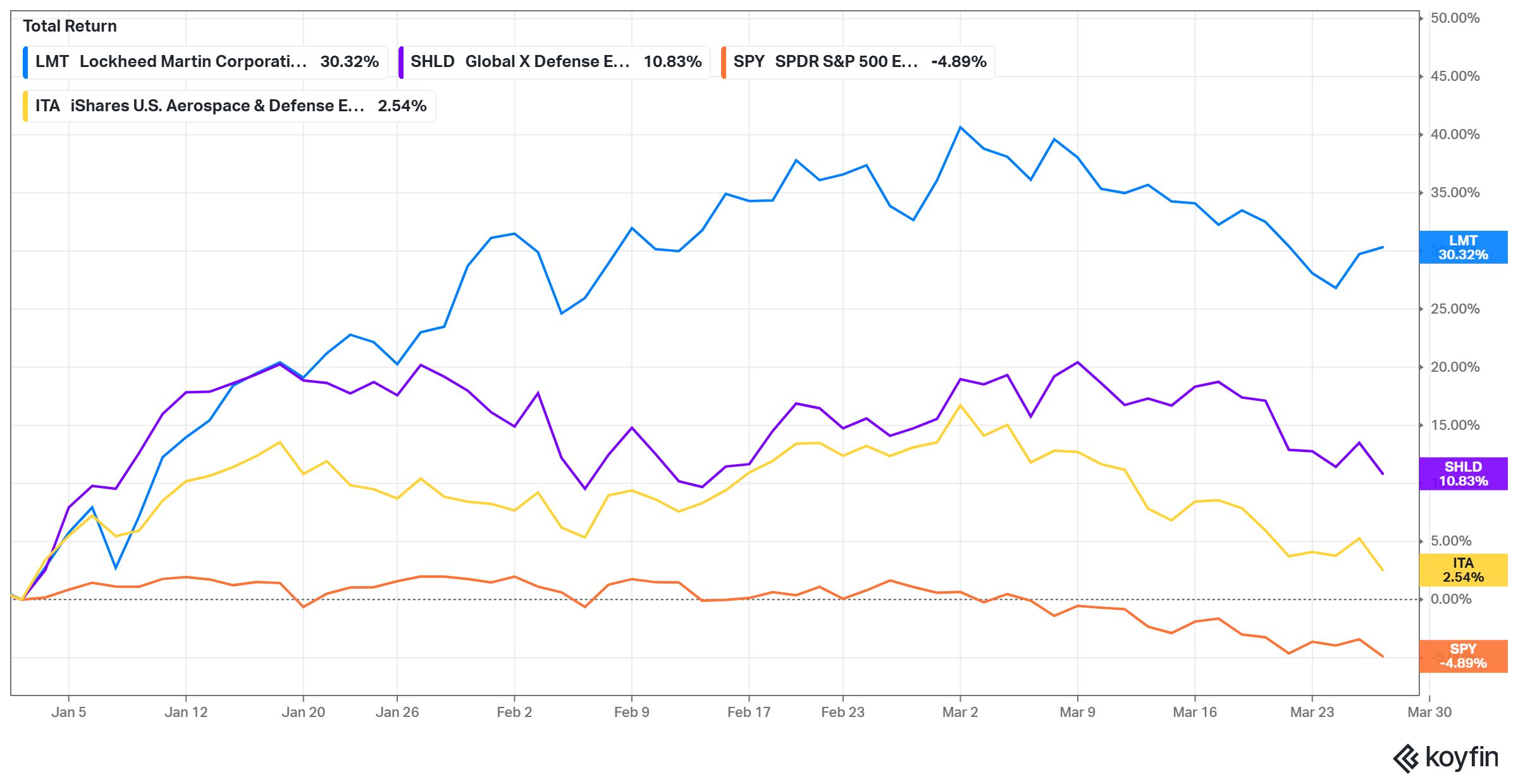Lockheed vs SHLD ETF vs SPY vs ITA YTD performance