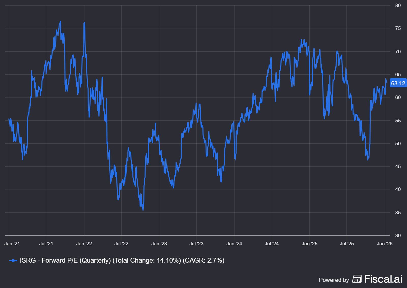 The 10-year historical P/E for this stock is 40x. Even at the peak of the COVID recovery in 2021, ISRG only traded at 65x forward earnings. Today's 72x assumes procedure growth sustains at 17-20% annually, margins expand back to 70%, and Hugo doesn't meaningfully impact market share.