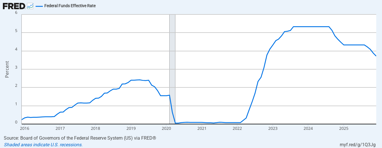The current federal funds rate sits at 3.50-3.75%, and the dot plot from December's meeting projected just one 25 basis point cut in 2026.
