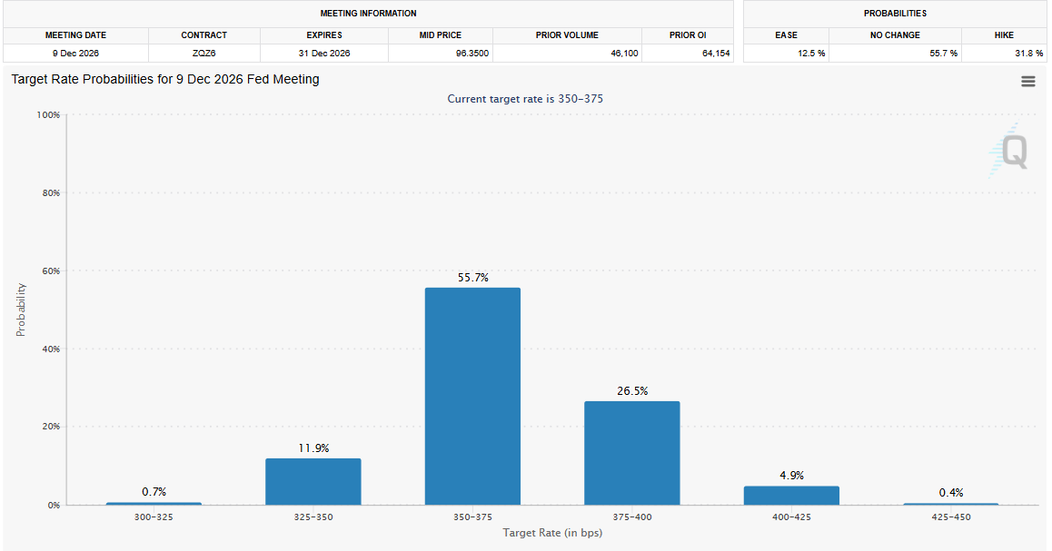 The market is now pricing a single 25-basis-point cut in December 2026 and absolutely nothing before that.