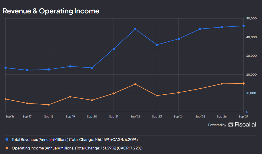 QCOM Revenues and Net Operating Income - by year - charted by fiscal.ai
