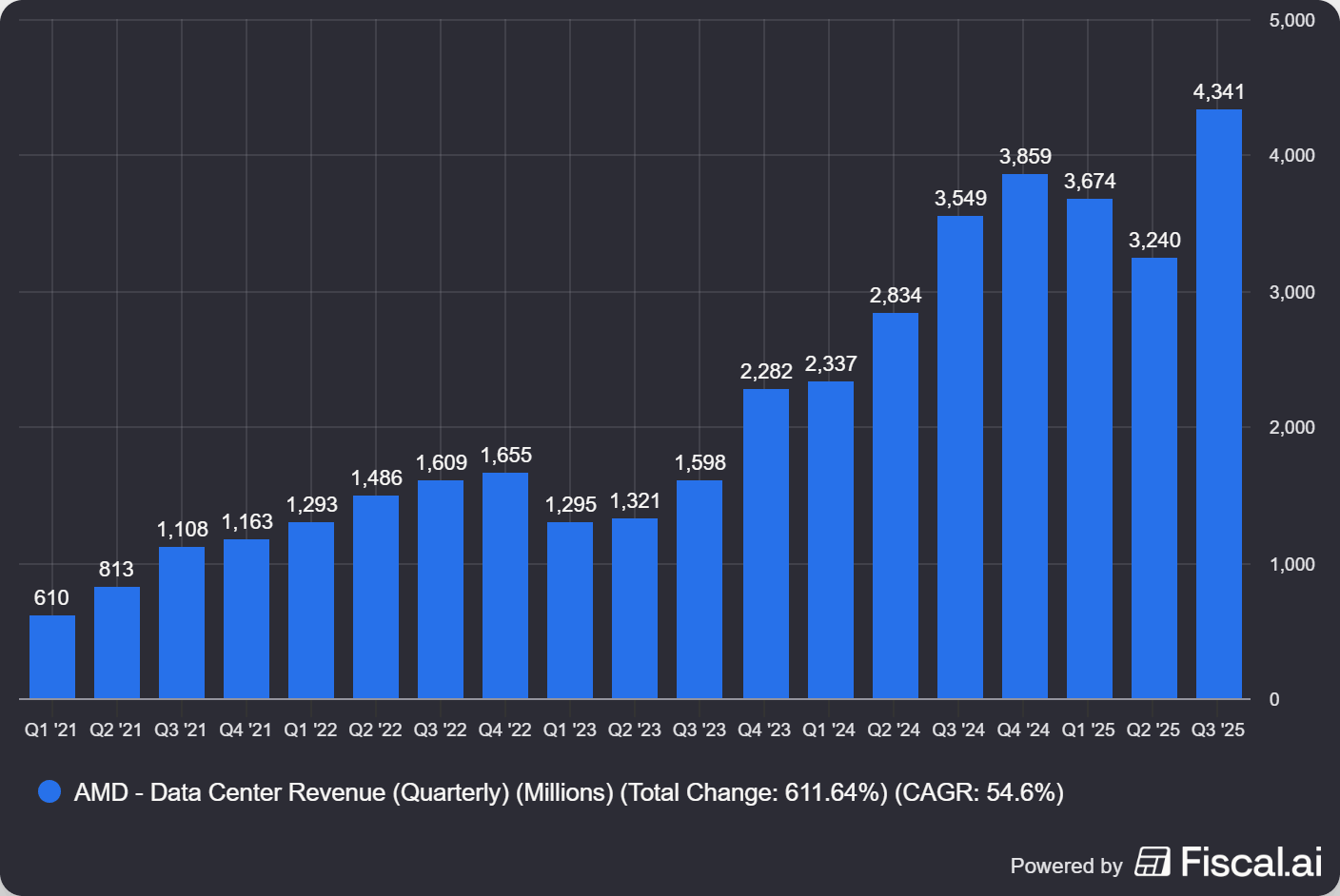 AMD's data center revenue hit $4.3 billion in Q3 2025, up 22% year-over-year. That's nowhere near Nvidia's $51 billion data center business, but the trajectory matters.