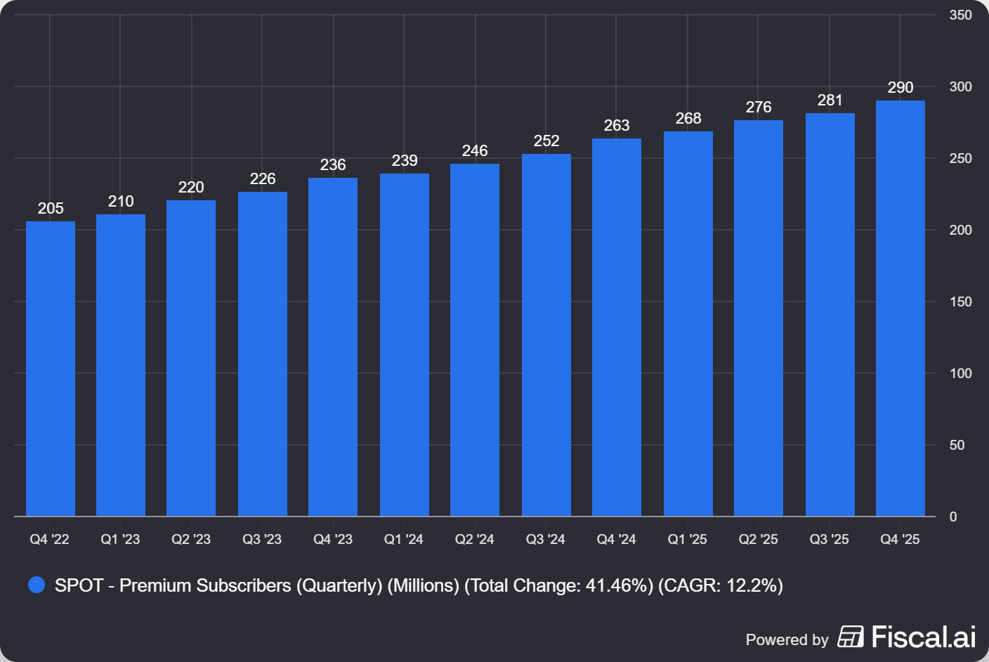 I'll admit this surprised me. At 751 million monthly active users, you would expect Spotify to be hitting saturation. Instead, Q4 delivered 38 million net MAU adds, the highest quarterly number in the company's history.