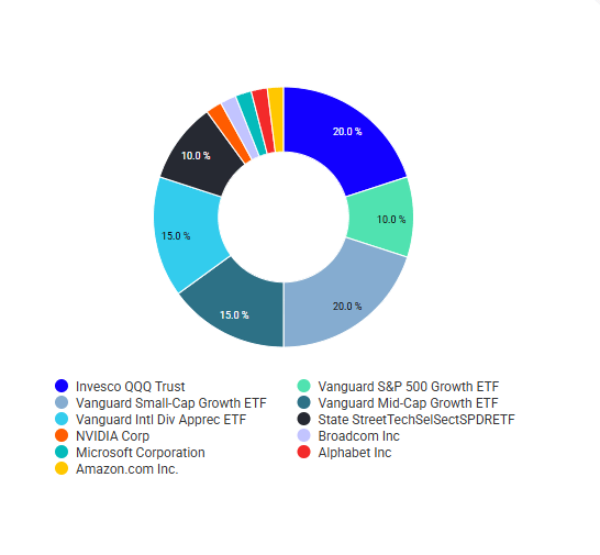 This is your foundation, companies like Microsoft, Nvidia, Google, and Amazon. Split between QQQ (Invesco Nasdaq-100, tracking the biggest tech names, 0.18% expense ratio) and VOOG (Vanguard Mega Cap Growth, 0.10% ER for slightly broader exposure).