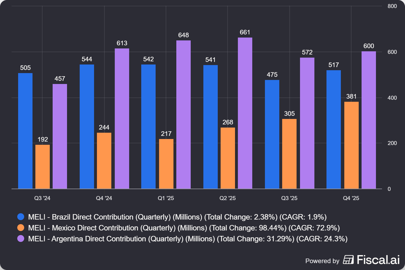 In Brazil, GMV grew 35% year over year alongside a 45% increase in sold items. The acceleration in unit volume suggests lower prices and easier shipping are pulling new behavior from existing users. Management also reported record NPS in commerce and fintech in Brazil, Mexico, and Argentina for 2025.