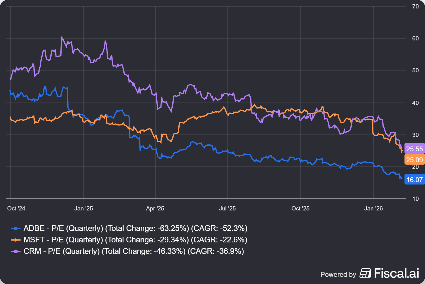 Forward P/E multiples compressed from 39x to 21x for the median software company, per analysis of 157 public SaaS firms. Adobe now trades at 12x forward earnings versus its five-year average of 30x.