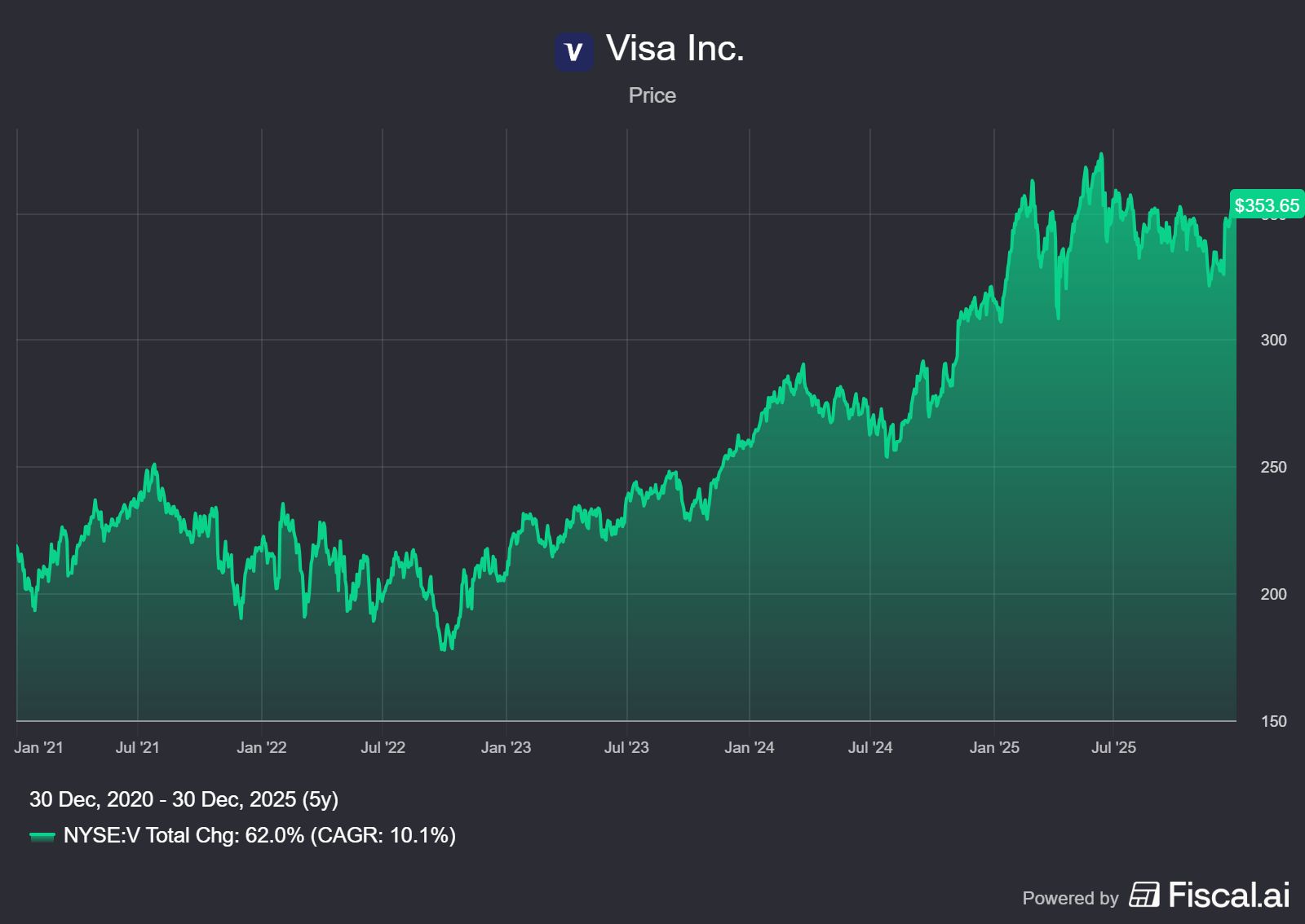 As of December 30, 2025, Visa sits at a $630 billion market cap, having delivered a modest 10-12% return year-to-date while trading about 6% below its June 2025 all-time high of $375.