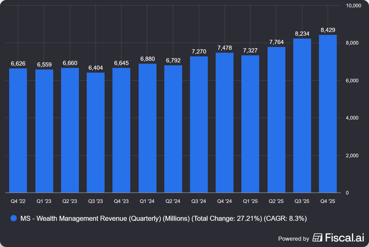 This isn't your grandfather's investment bank anymore. Morgan Stanley spent the last decade transforming into a wealth management machine that happens to have elite investment banking on the side. The numbers tell the story and wealth management now generates over half of total revenues. In Q4 2025, the wealth unit brought in $8.4 billion in revenue (up 13%) with client assets hitting $9.3 trillion. That's recurring, stable money that doesn't vanish when deal markets dry up.